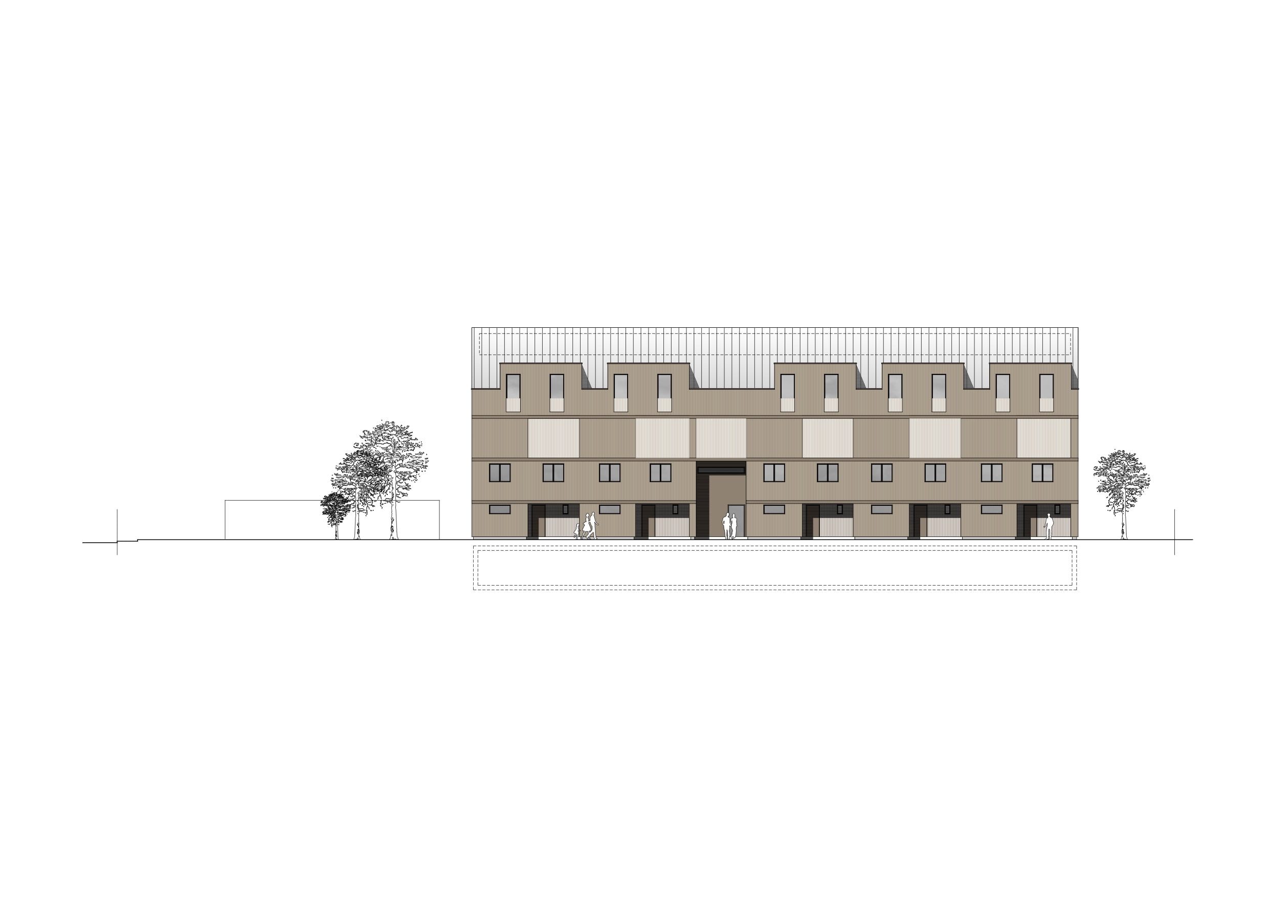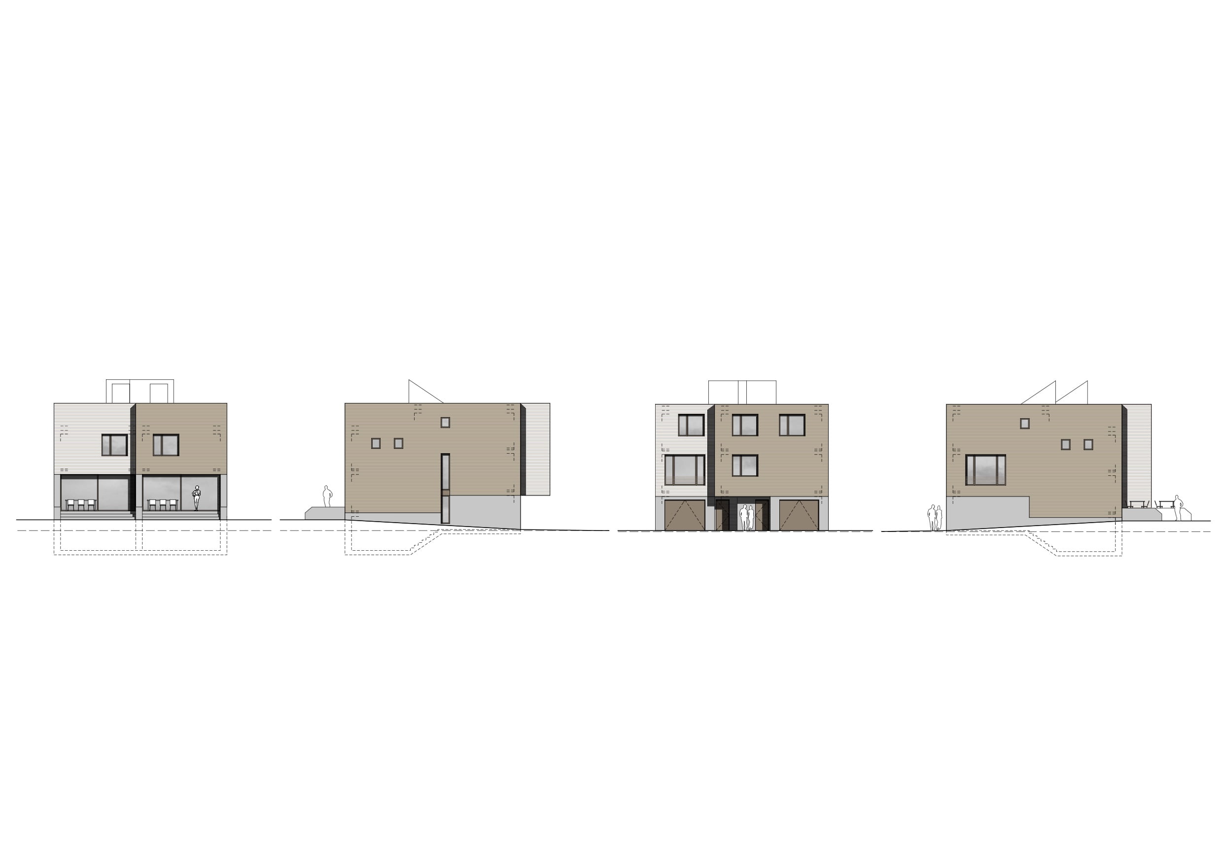 In unserer Variante entstehen der Strasse entlang 5 Reihenhäuser, die je doppelt genutzt werden. Also insgesamt 10 Wohnungen. Zusätzlich sind drei Doppeleinfamilienhäuser vorgesehen. Die Allgemeinfläche ist grosszügig gestaltet und so entwickelt, dass ein belebter Aussenraum entsteht. Die Verkehrsfläche ist als Spielstrasse vorgesehen.